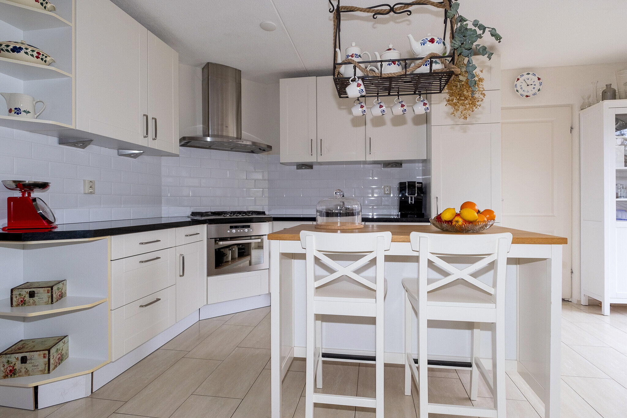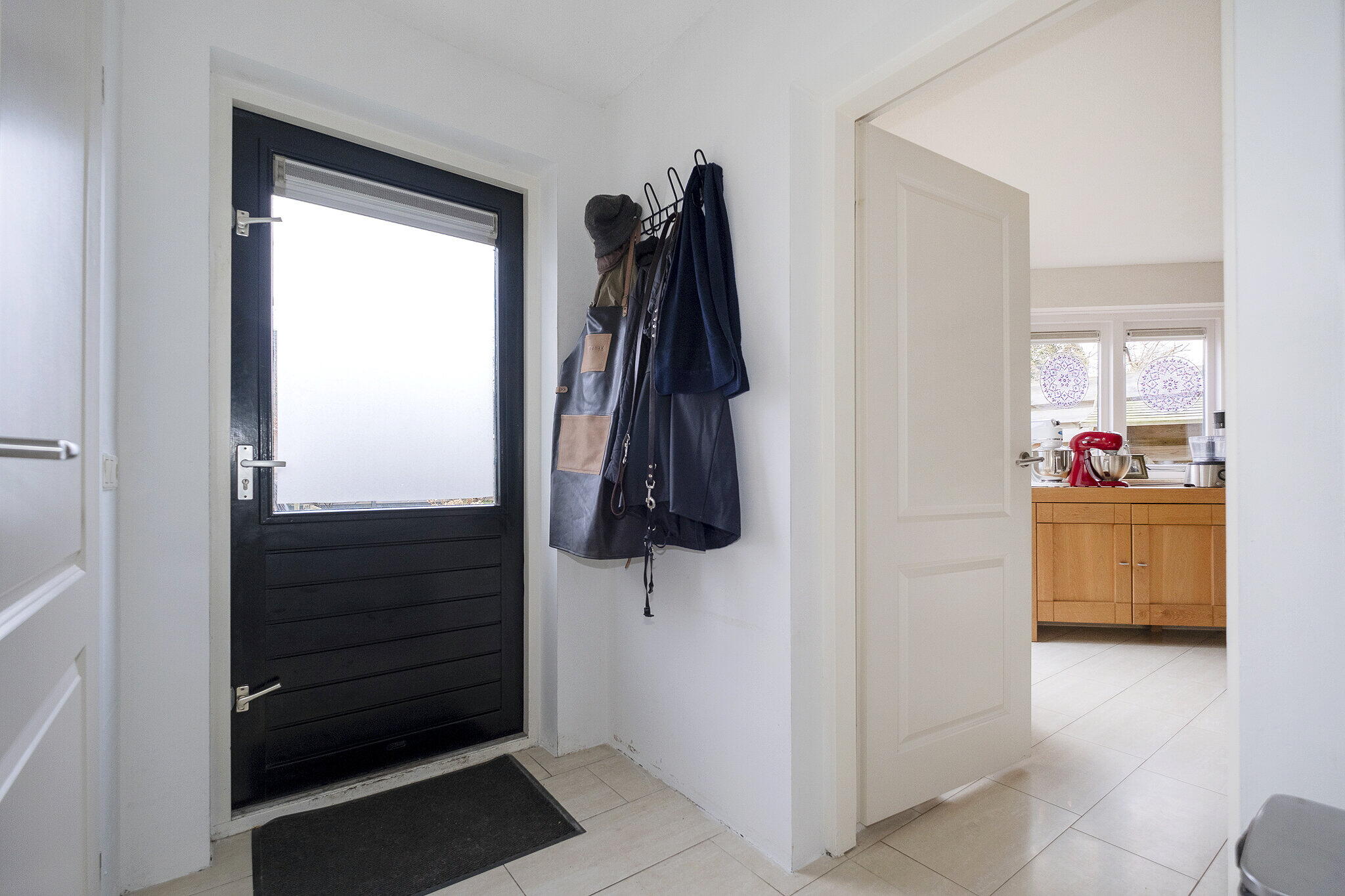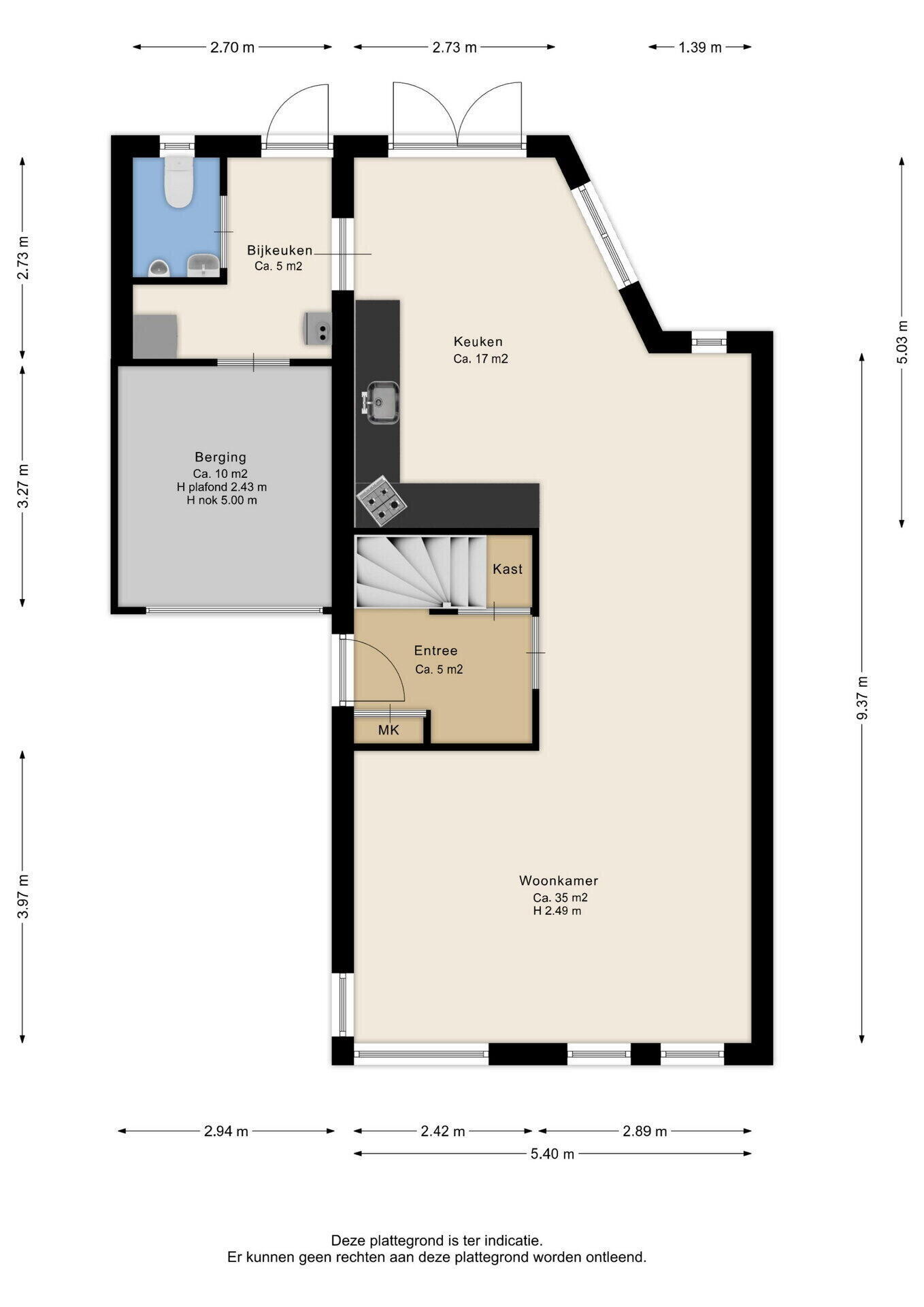 Hal met meterkast en trapopgang. De ruime woonkamer met open keuken (samen ca. 52m²) zijn voorzien van een lichte tegelvloer met vloerverwarming. De open keuken is voorzien van een 5-pits kookplaat, oven, afzuigkap, koelkast, vriezer, vaatwasser en volop bergruimte. Achter de keuken is een ruime bijkeuken met witgoed-aansluiting en modern toilet.