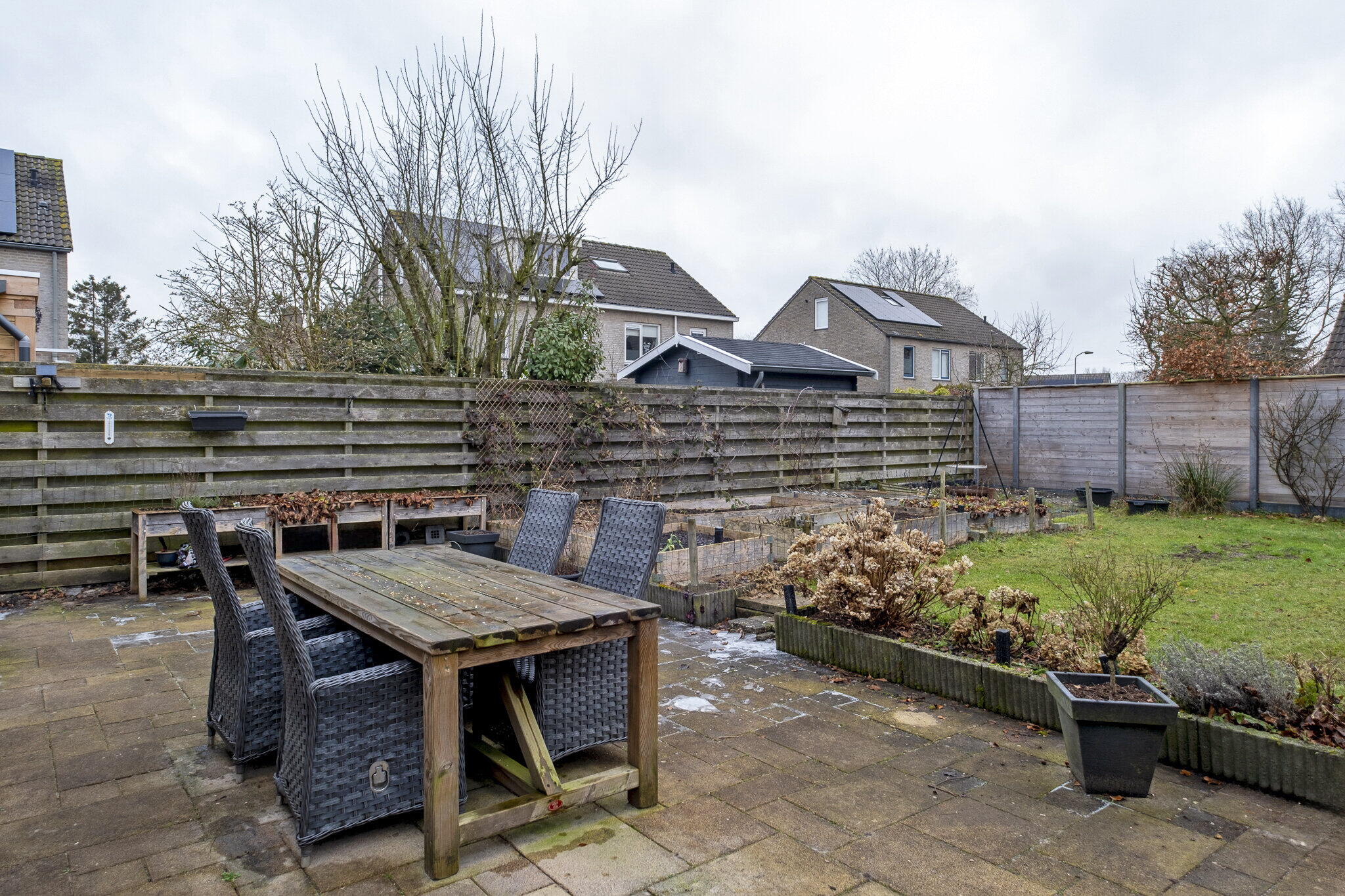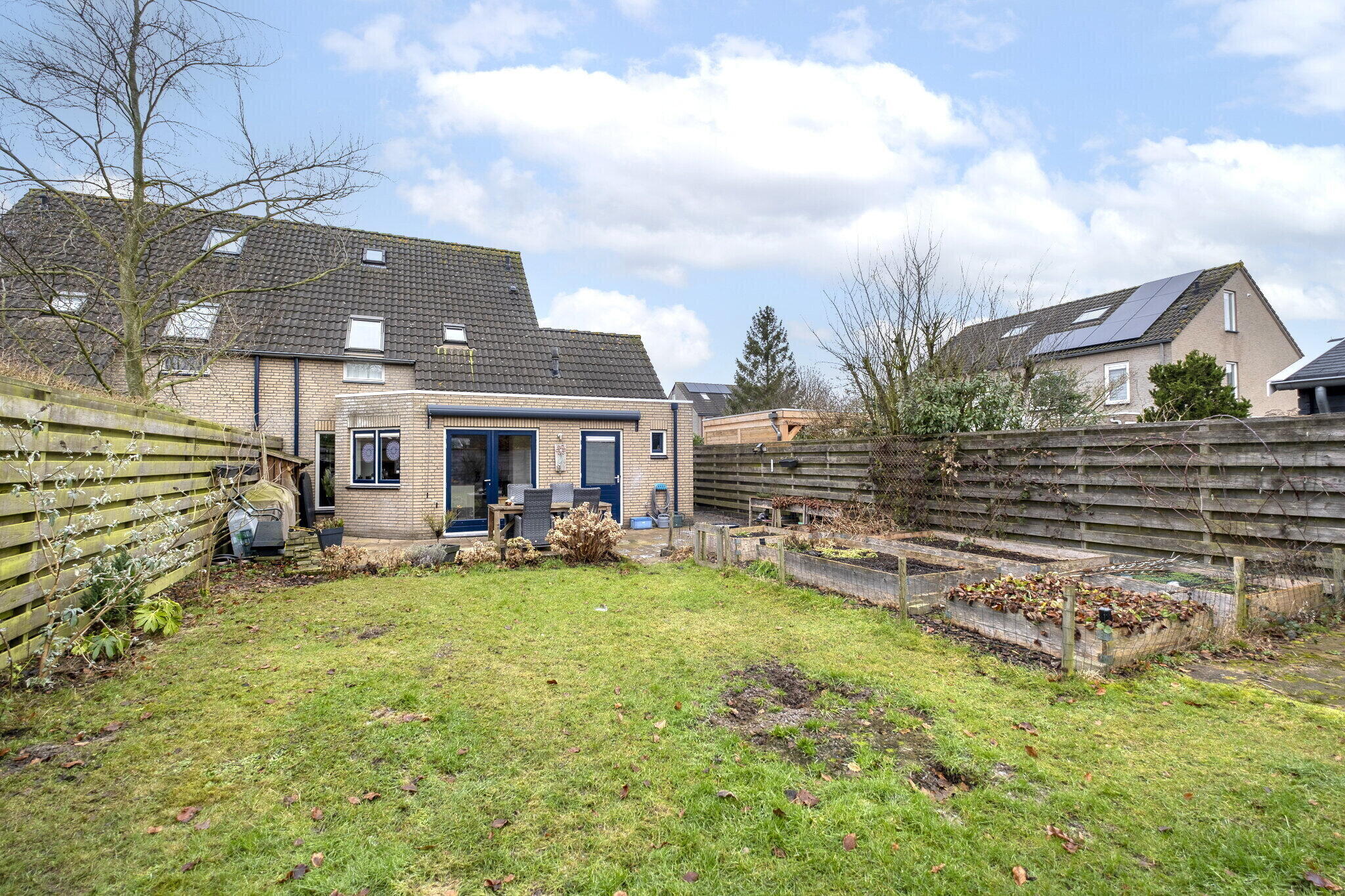De tuin is gelegen op het oosten en is voorzien van twee fijne terrassen, een moestuin en gazon. Het terras in het verlengde van de aanbouw is direct bereikbaar vanuit de keuken door openslaande deur, daarnaast is hier een zonnescherm aanwezig waardoor hier ook bij hogere temperaturen nog heerlijk gezeten kan worden. De oprit aan de voorzijde biedt de mogelijkheid om meerdere auto's op eigen terrein te parkeren.
